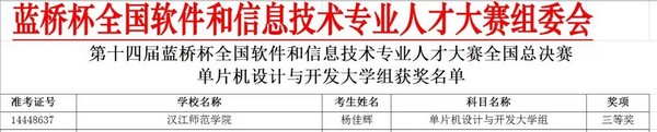 日前,第十四届“蓝桥杯”大赛全国总决赛成绩揭晓,太阳成集团122ccvip杨佳辉同学喜获电子类(单片机设计与开发大学组)三等奖的好成绩。