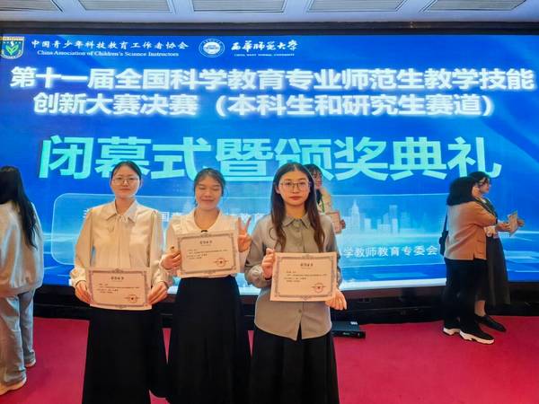 12月1日至3日,由中国青少年科技教育工作者协会主办,西华师范大学承办的第十一届全国科学教育专业师范生教学技能创新大赛决赛(本科和研究生赛道)在西华师范大学华凤校区举行。太阳成集团122ccvip胡蓉、姜心懿、李卓群等3名选手在决赛中敢打敢拼,最终取得了3项三等奖的成绩。